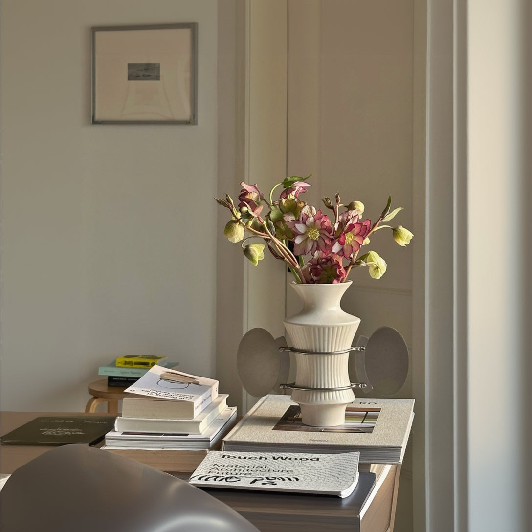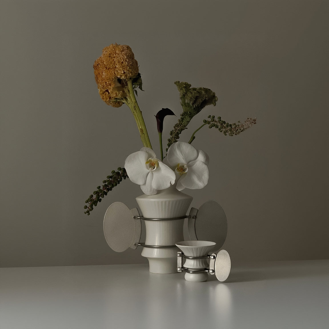 From CR3304’s Dislocated Space collection, this sculptural ceramic vase pairs a ribbed ceramic body with exposed stainless steel. Hand-polished oval handles—assembled without welding—bring an industrial hardware edge to a refined, home-ready form, balancing strength and delicacy in one statement piece.