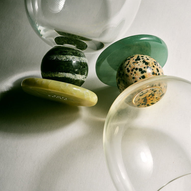This wine glass pairs a clear high-borosilicate glass bowl with a sculptural stem of dalmatian speckled jasper and green aventurine. Natural stone variations make each piece subtly unique in colour, tone, and texture—an elevated statement for everyday pours and hosting.