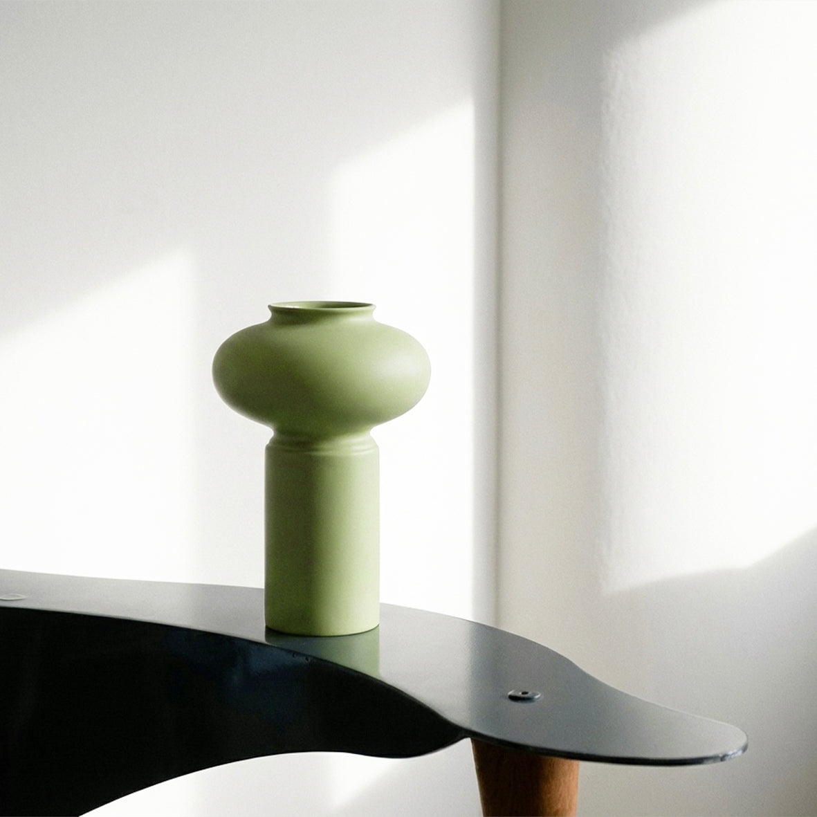 This pistachio-green ceramic vase features a softly exaggerated silhouette with a flared, cloud-like top and slender base. Its unglazed matte finish reveals the raw clay texture, offering sculptural balance with or without a floral arrangement.