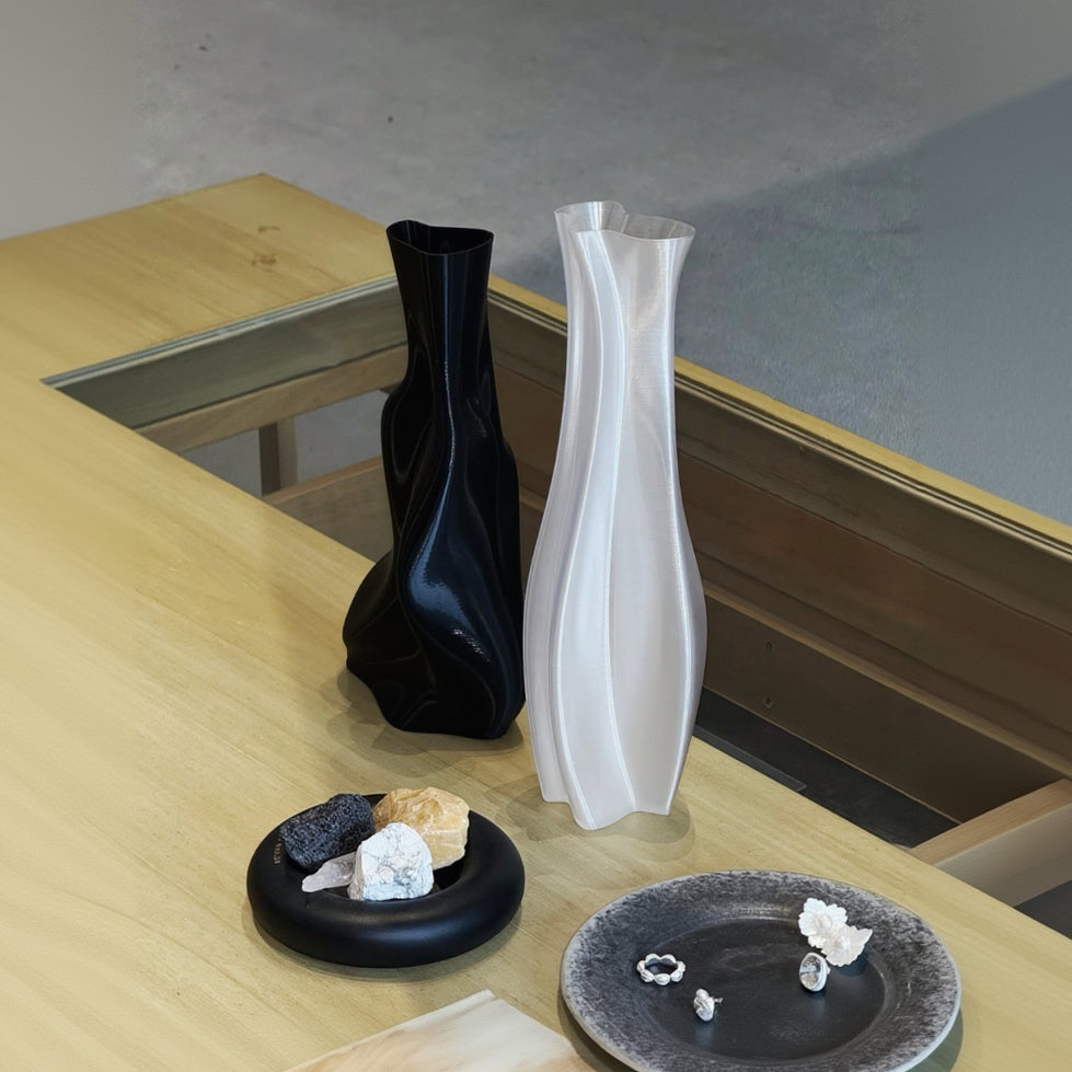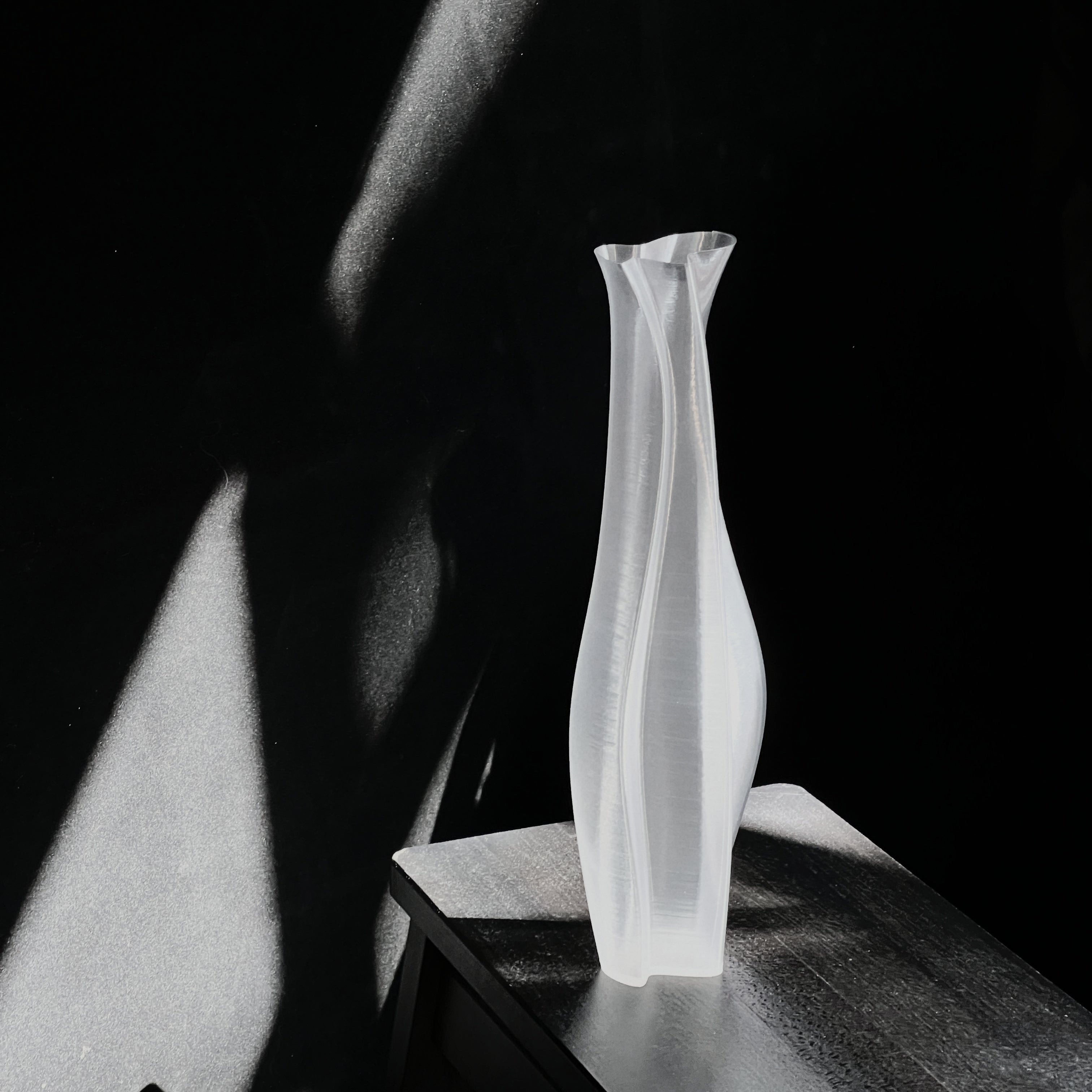 3D printed in translucent PETG, this vase has a smooth, flowing shape with softly fluted ridges. Its gentle ripple texture comes from fine printed layers, showing how it was made while adding beautiful light and shadow across the surface.