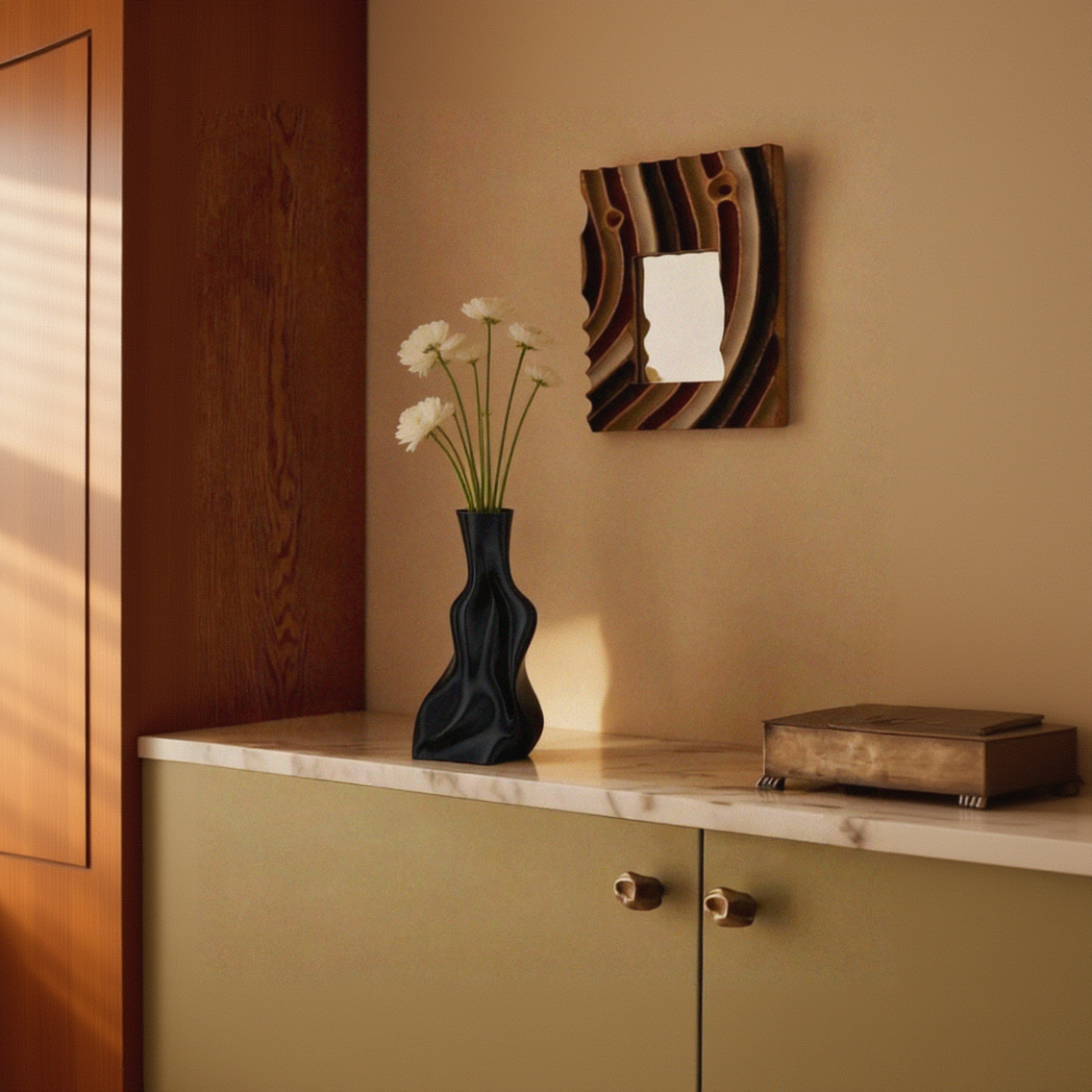 3D printed in black PETG, this vase shows off the detail of the printing process. Its ripple-like texture comes from fine layers built up one by one, revealing subtle lines across the surface. The layered construction makes it feel both sturdy and sculptural.